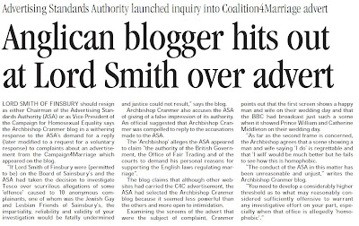 His Grace's ASA saga is covered on the top of p3 of this week's Church of England Newspaper. They refer to his 'withering response to the ASA’s demand for a reply' (which they 'later modified to a request for a voluntary response'). In light of this, His Grace's demand remains that the Lord Smith of Finsbury should resign either as Chairman of the Advertising Standards Authority or as Vice President of the Campaign for Homosexual Equality. He cannot do both - not if the ASA seeks to harass and bully those who carry perfectly innocuous advertisements promoting the traditional view of marriage, and entertain that such advertisements might be 'offensive and homophobic'.